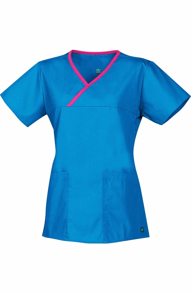 The Maevn 1026 scrub top has cute mock wrap styling and fashion contrast trim at the neck. This scrub top also has two front patch pockets, there is a smart phone pocket layered inside the left front pocket. Inside the right front pocket you’ll find a three-part accessory loop. This top has set-in sleeves for mobility. There is double-stitching at the front yoke, shoulders and pockets for durability. The fabric is a comfortable poly/cotton blend.