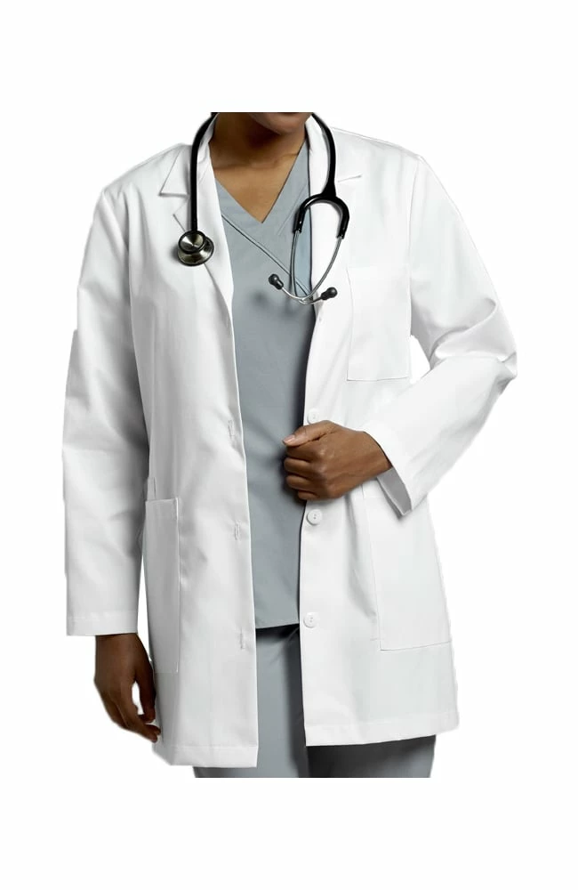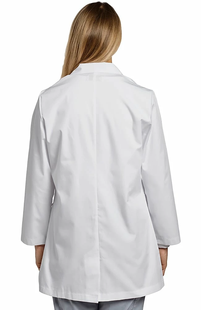 This is a classic lab coat from Marvella by White Cross with a notched lapel, button closure, two patch pockets at the hips and one patch pocket at the left breast. It is made from a comfortable poly/cotton poplin. The length is 32″.