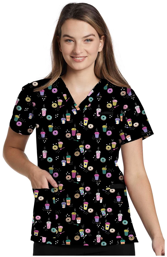 Work hard, break hard. The Marvella by White Cross Women’s V-Neck Break Time Print Scrub Top features a fun, playful print that looks great on and off the job. This breathable scrub top has pockets for your things and a flattering silhouette.